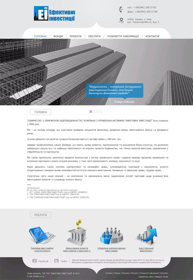 www.ei.co.uaКомпанія з управління активами надає такі послуги як: реалізація інвестиційної стратегії клієнта, фінансування проектів інвестування в нерухомість, управління корпоративними інвестиційними потоками, індустріальний девелопмент.