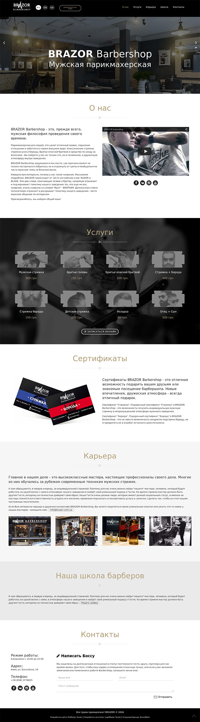 www.brazor.com.uaBRAZOR Barbershop - це перш за все чоловіча філософія проведення свого часу. Перукарня для людей, хто цінує відмінний сервіс, серйозне ставлення та піклується про свій зовнішній вигляд. Класичні стрижки, стрижки вусів і бороди, гоління небезпечною бритвою та засоби догляду за волоссям - Ви знайдете у нас не тільки це, а й розуміння, і дружню атмосферу всередині закладу.