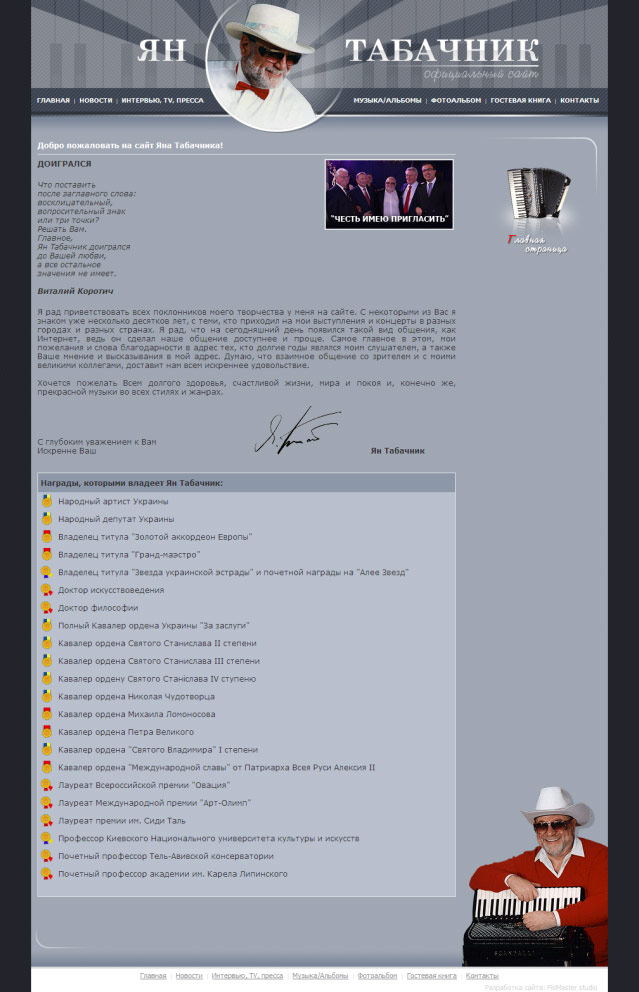 yan-tabachnik.com.uaИмя знаменательного Маэстро современности, народного артиста Украины, полного кавалера трёх орденов, лауреата самых престижных международных конкурсов музыкантов-исполнителей, профессора, почетного профессора высших музыкальных заведений Европы, общественно-политического деятеля, мецената, организатора всемирно известных музыкальных программ и фестивалей-конкурсов ("Честь имею пригласить", "Владимир Крайнев приглашает", "AccoHoliday"), основателя Международного творческого центра Яна Табачника ассоциируется с аккордеоном - инструментом, которому он посвятил всю свою жизнь. Большое количество высоких официальных мировых отличий блестящего творчества Яна Табачника совмещается из самым важным для художника - ИМЕНЕМ, которое он заслужил честно и правдиво.