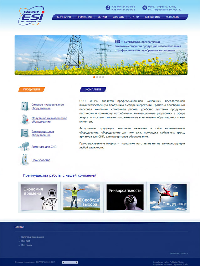 www.esi.net.uaООО «ЕСИ» является профессиональной компанией предлагающей высококачественную продукцию в сфере энергетики. Ассортимент продукции компании включает в себя низковольтное оборудование, оборудование для монтажа, прокладка кабельных трасс, арматура для СИП, электрощитовое оборудование. Производственные мощности позволяют изготавливать металлоконструкции любой сложности.