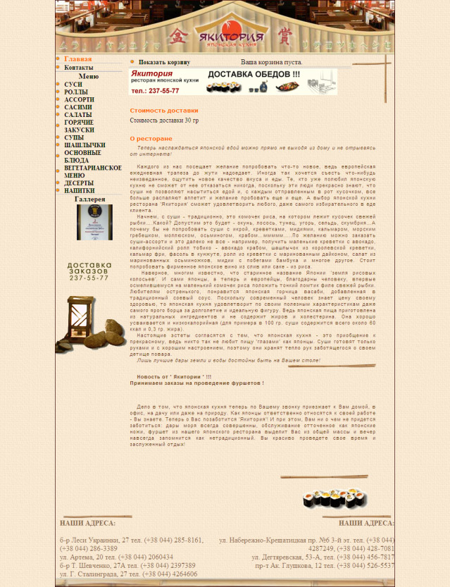 www.yakitoriya.com.uaЯпонська кухня - це не просто данина моді, це вроджене почуття прекрасного, адже ніхто так не любить їжу «очима», як японці. «Якіторію» обирають ті, хто цінує смак справжніх, правильно приготовлених суші та знає ціну своєму здоров'ю. Демократичність закладу лише підвищує його популярність серед любителів японської кухні. Тепер ваші улюблені страви японської кухні Ви можете замовити прямо із сайту!