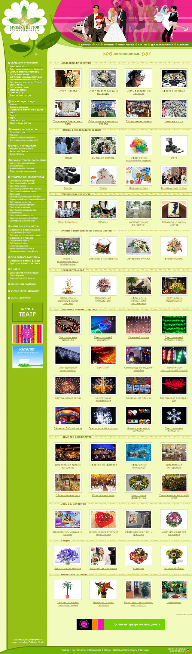 Студія дизайну оформляє весілля, ювілеї, дні народження, такі свята як 8 березня, день святого Валентина та багато інших. У нашій дизайн студії, професійні флористи дизайнери, створюють справжні витвори мистецтва.