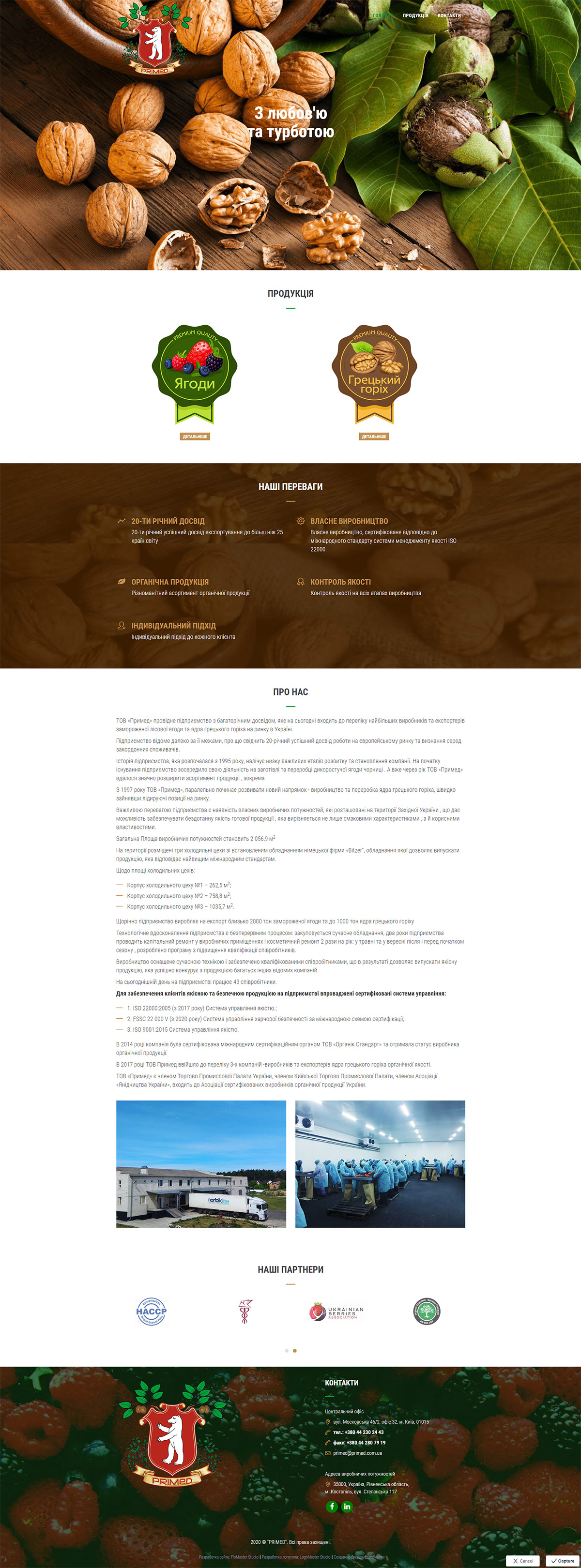 www.primed.com.uaКомпанія «Примед» (м.Київ) - один із найбільших виробників та експортерів замороженої ягоди та волоського горіха в Україні, який розпочав свою діяльність у 1995 році. Одним із факторів успіху компанії є довгострокові та надійні відносини з постійними діловими партнерами. Компанія приділяє особливу увагу покращенню взаємодії між собою, оцінці потреб клієнтів та їх задоволенню.