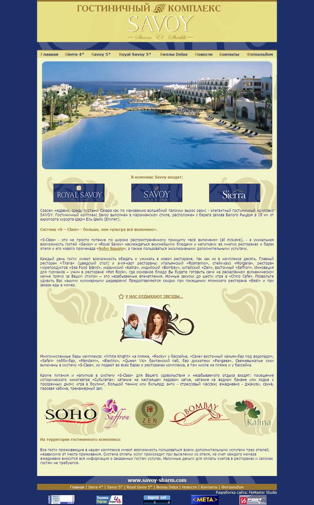 www.savoy.com.uaГотельний комплекс Savoy виконаний у марокканському стилі, розташований біля берега затоки Білого Лицаря за 10 км від аеропорту курорту Шарм Ель Шейх (Єгипет).