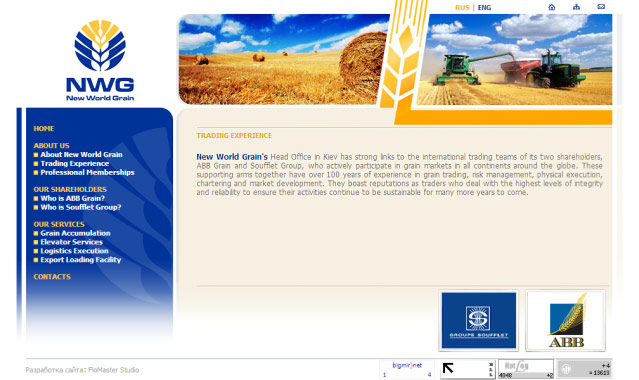www.newworldgrain.com"Нью Ворлд Грейн" (NWG) - це спільне підприємство, що функціонує на території України з сильною фінансовою підтримкою, власниками якого є представник Австралійського аграрного бізнесу, компанія ABB Grain ("ЕйБіБі Грейн") та Французька аграрно-промислова група " Суффле".