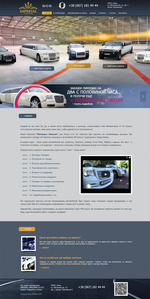 www.ilimo.com.uaКомпанія «Імперіал Лімузин» працює у сфері прокату лімузинів та автомобілів класу «ЛЮКС» у Києві. У парку є ціла низка ексклюзивних авто: лімузини Chrysler 300C, лімузини Lincoln Town Car, лімузини Hummer H2 і H3, седан Maybach, седан Rolls Royce Ghost та седан Chrysler 300C.