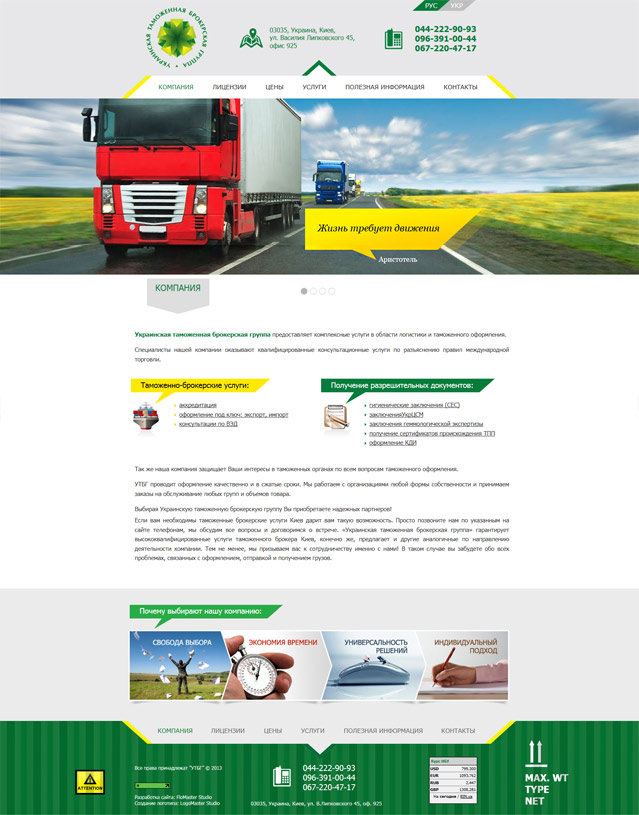 www.ucbg.com.uaУкраїнська митна брокерська група надає комплексні послуги у галузі логістики та митного оформлення. Фахівці компанії надають кваліфіковані консультаційні послуги щодо роз'яснення правил міжнародної торгівлі.