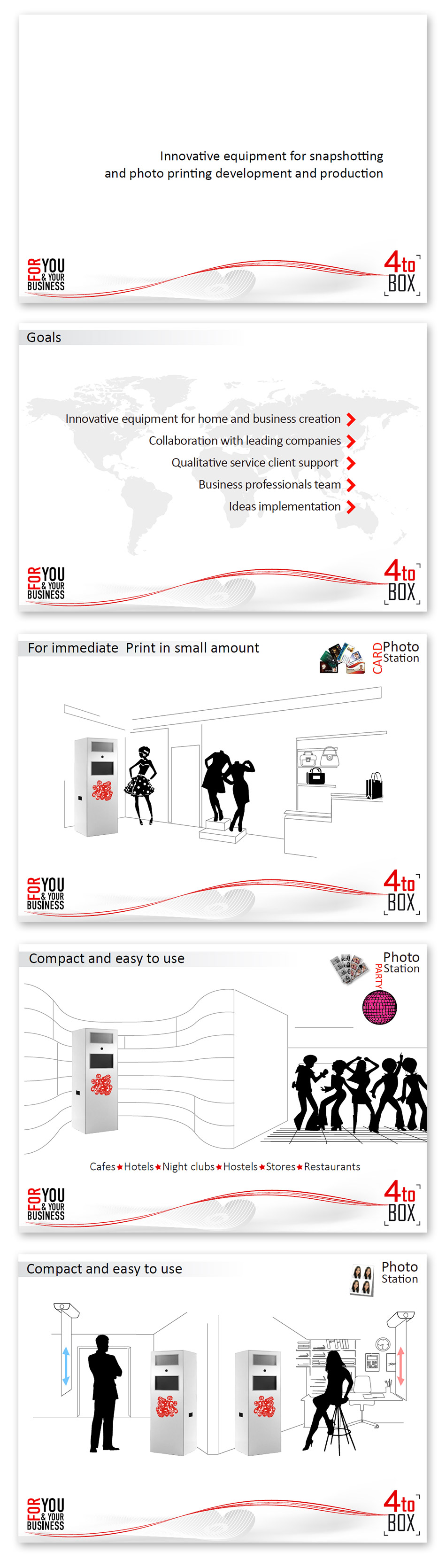 До студії звернулися за створенням та оформленням презентації ТМ "4toBOX": “Розробка та виробництво інноваційного обладнання для моментального фото та фотодруку”. Презентацію було розроблено для ринку США.