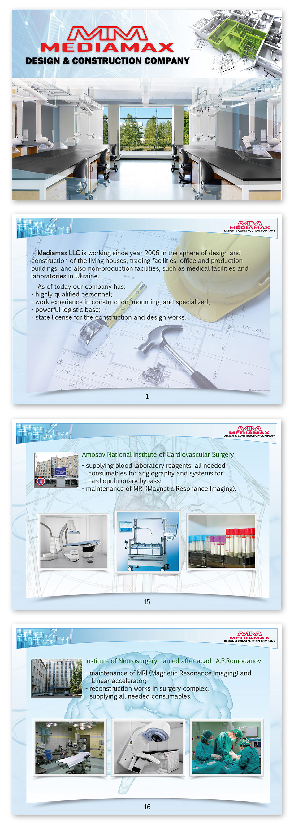 До студії звернулися за створенням дизайну та оформленням презентації будівельної компанії на 20 сторінок. Було розроблено дві версії презентації – для виступу (в PowerPoint) та для друку у поліграфії (.pdf). Робота була виконана в дуже стислий термін - 5 робочих днів. Презентація призначена для міністерства. Весь процес розробки щодня узгоджувався із Замовником, який безпосередньо брав участь у роботі у нашому офісі.