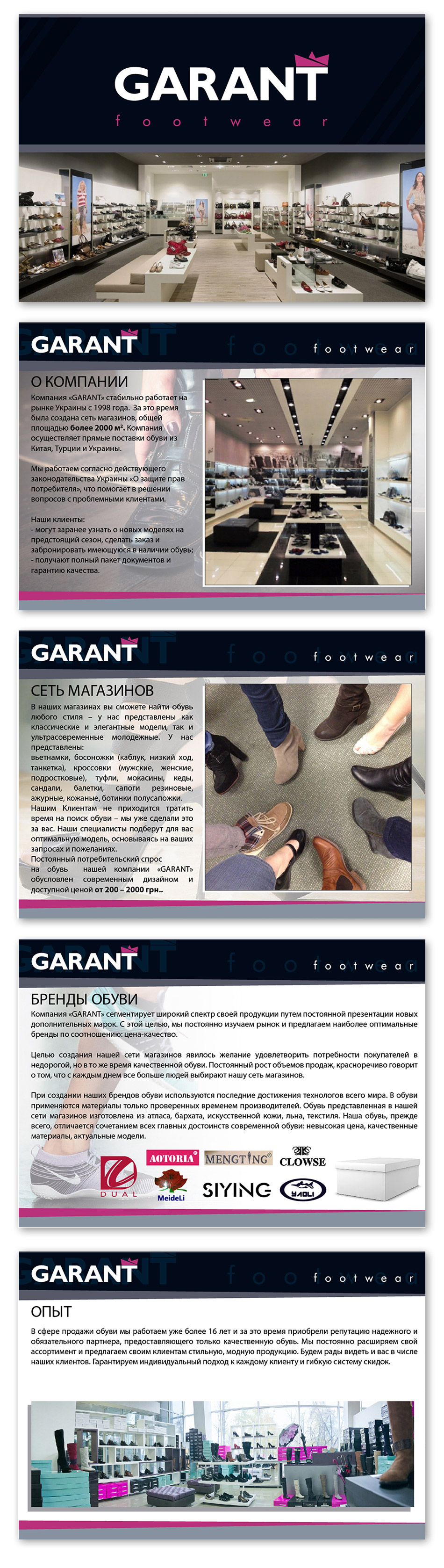Компанія "GARANT" стабільно працює на ринку України з 1998 року. За цей час була створена мережа взуттєвих магазинів, загальною площею понад 2000 м 2 . Компанія здійснює прямі поставки взуття з Китаю, Туреччини та України. У магазинах покупець може знайти взуття будь-якого стилю – тут представлені як класичні та елегантні моделі, так і ультрасучасні молодіжні: в'єтнамки, босоніжки (каблук, низький хід, танкетка), кросівки (чоловічі, жіночі, підліткові), туфлі, мокасини, кеди, сандалі , балетки, чоботи гумові, ажурні, шкіряні, черевики.