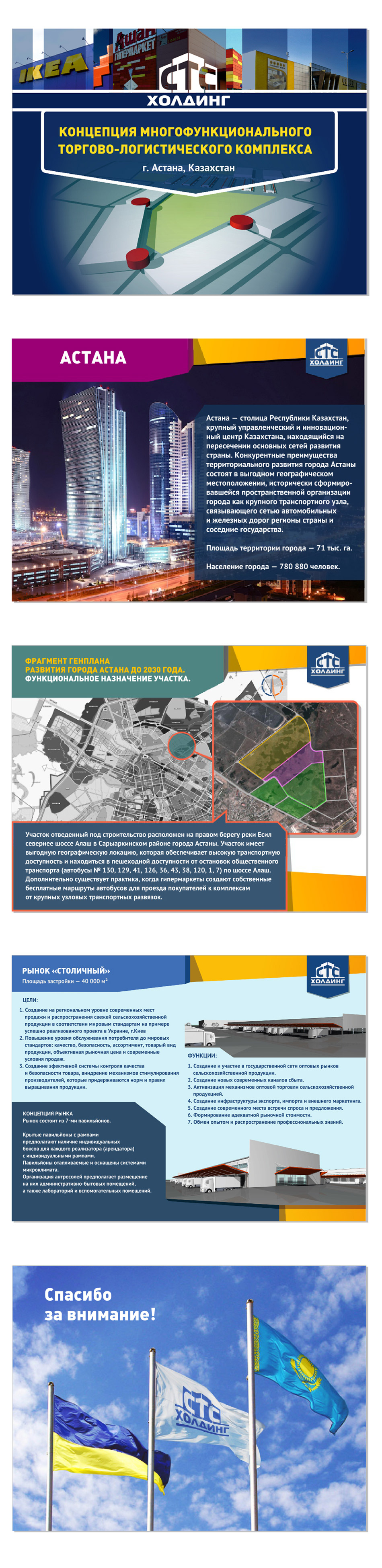 До студії звернулися за створенням дизайну та оформленням презентації концепції багатофункціонального торгово-логістичного комплексу в м.Астана, Казахстан. Презентація була призначена для президента країни та перших осіб держави, тому всі роботи були виконані на найвищому рівні, весь процес розробки одразу узгоджувався із Замовником.