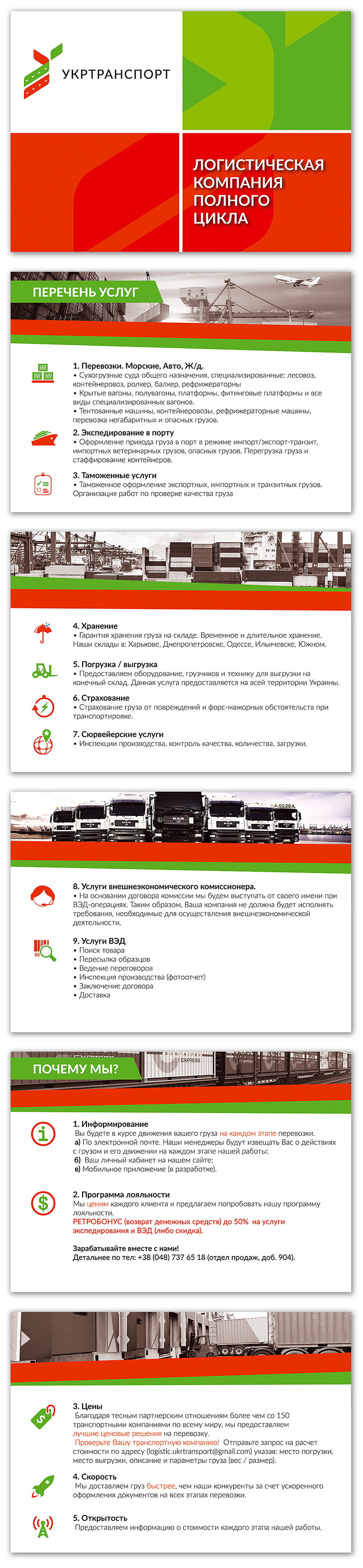 Організація «УКРТРАНСПОРТ» є одним із ключових операторів на українському ринку транспортної логістики. Основні напрямки діяльності – морське та залізничне експедирування вантажів, автомобільні перевезення, складська логістика, митні послуги. Керівництво компанії, проводячи постійні навчання та тренінги персоналу, формує у співробітників сучасний погляд на концепцію ринку вантажоперевезень та послуг логістики. Завдяки цьому в найкоротші терміни було впроваджено інноваційні проекти, що дозволяють підвищити ефективність та якість послуг.