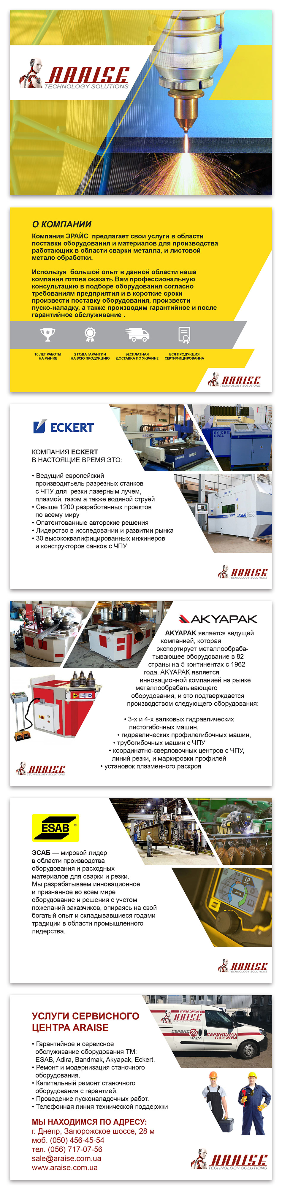 Компанія ЕРАЙС пропонує свої послуги в галузі постачання обладнання та матеріалів для виробництва працюючих у галузі зварювання металу, та листової металообробки. Використовуючи великий досвід у даній галузі, компанія готова надати професійну консультацію. у підборі обладнання згідно з вимогами підприємства та в короткі терміни провести поставку обладнання, провести пуско-налагодження, а також гарантійне та після гарантійне обслуговування.