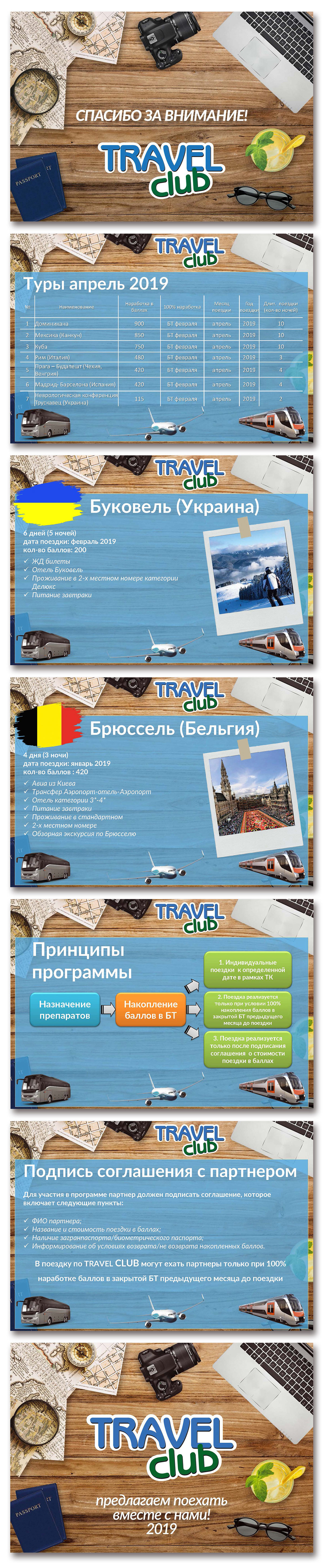 Розробка концепції дизайну та оформлення презентації для туроператора “Travel Club” - туристична компанія, що стрімко розвивається та встигла реалізувати безліч турів та зарекомендувати себе на туристичному ринку України. Основними напрямами діяльності є країни Європи та Азії, а головним пріоритетом – індивідуальний підхід до кожного клієнта. Основна місія компанії – це створити казковий відпочинок для клієнтів із різними потребами, вимогами та бажаннями. На даному етапі діяльність компанії повністю спрямована на розробку нових цікавих маршрутів, визначення та встановлення конкурентоспроможних цін, налагодження партнерських відносин у межах України та за кордоном.