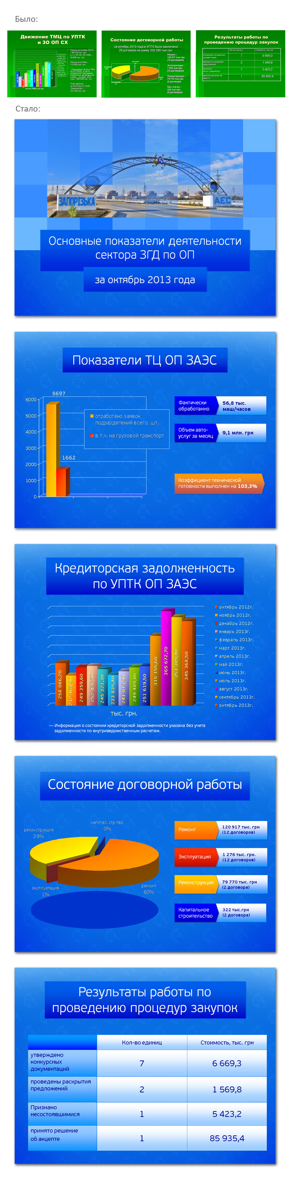 До студії звернулися за редизайном та оформленням презентації за основними показниками діяльності ЗАЕС. Робота була виконана протягом одного робочого тижня - було створено макети дизайну презентації та розроблено тематичні графічні елементи.