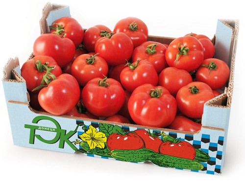 Розробка дизайну лотка для перевезення огірків та помідорів до Росії. Виробництво овочів (тепличне господарство) розміщено у Донецьку (це відображено у дизайні).